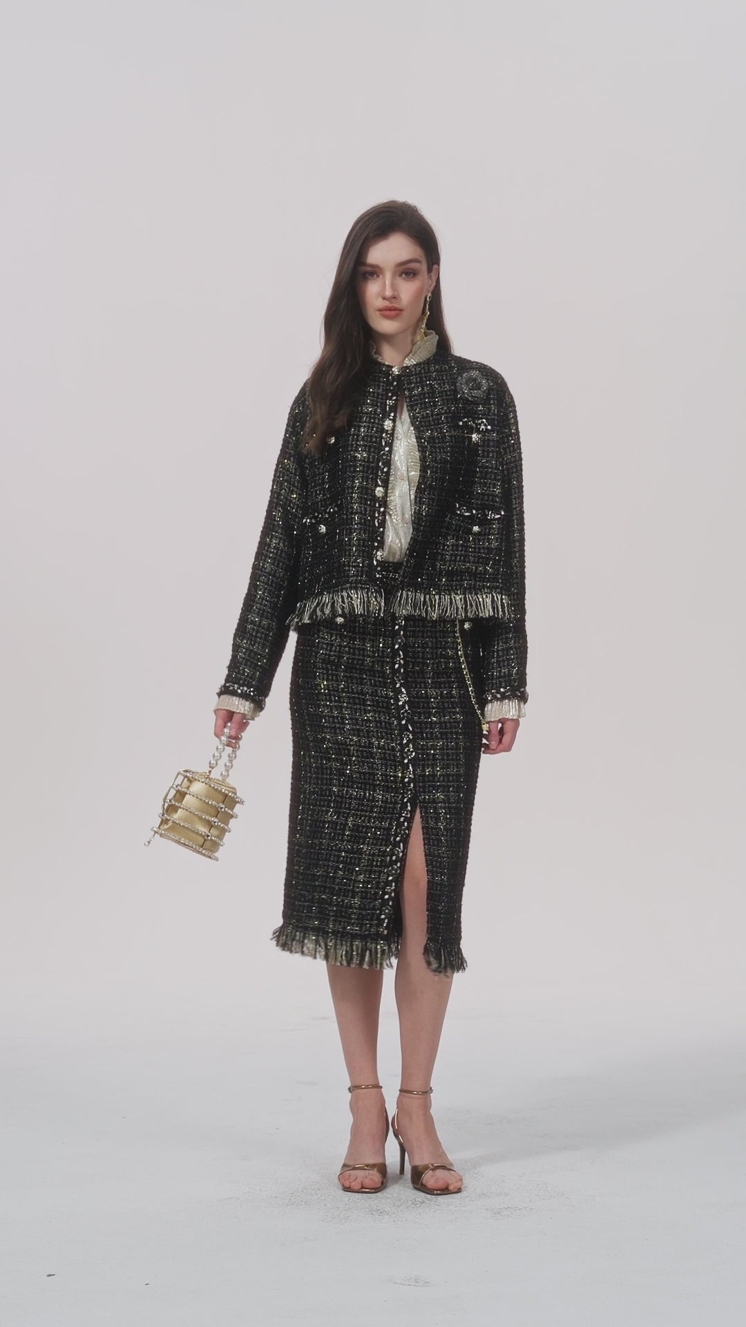 A midi tweed skirt in black‑and‑gold bouclé with hand‑applied beadwork, metallic thread texture, and a side slit finished with a fringed hem adds polished movement and refined surface detail to a classic silhouette. The fitted shape and rich materials make this piece feel elevated and composed, suitable for dressed occasions without being overly formal. Designed to feel special — never overdressed.