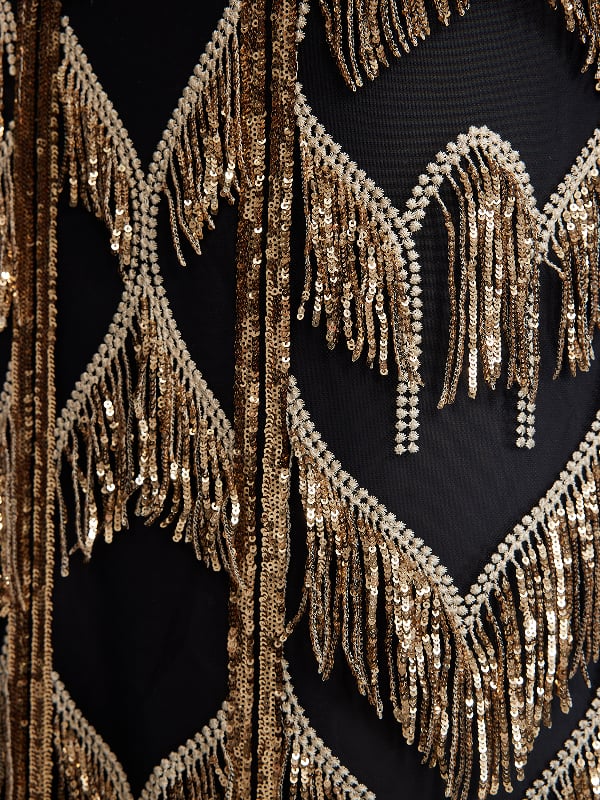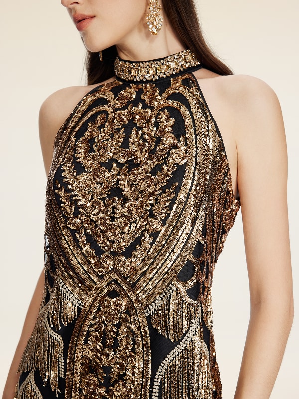 A striking black-gold halter gown with hand-applied sequins and fringe for a sculpted, luminous effect.